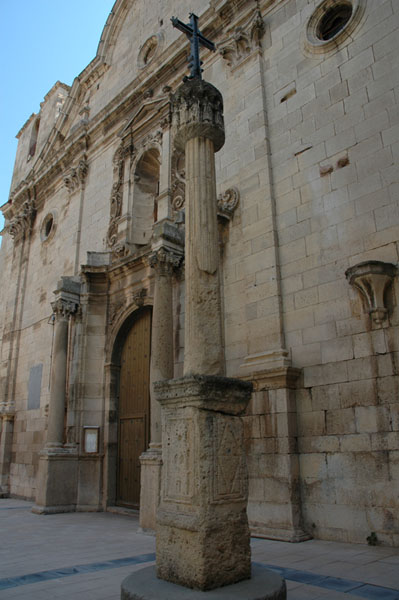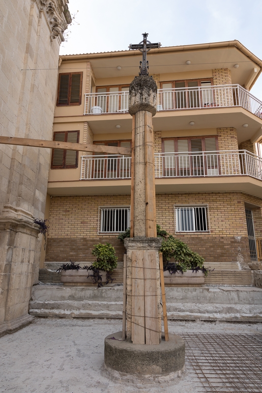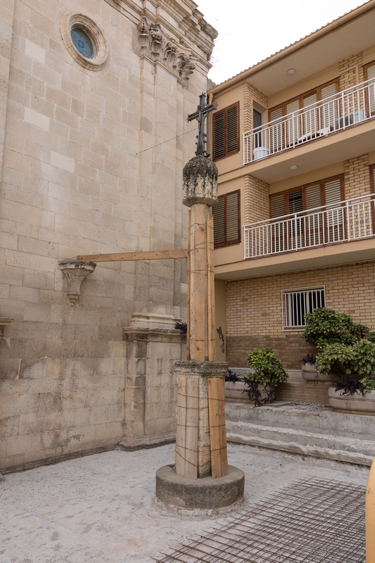 Crucero en piedra caliza muy erosionada, de estilo barroco, formado por cuatro cuerpos y emplazado sobre un zócalo circular de hormigón. Presenta una basa cuadrangular con decoración incisa en sus cuatro caras que forman entre caras figuras geométricas de rombo mientras que en la cuarta aparece el escudo de la localidad. Sustenta un fuste cilíndrico acanalado bastante dañado en la mitad inferior, sobre el que se coloca un tambor de piedra esculpida con las figuras de los apóstoles bajo conchas lobuladas. Sobre el tambor se dispone una cruz en hierro forjado claramente posterior a la original.